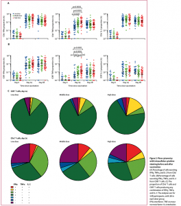 A replication defective Ad5 vectored vaccine expressing the spike glycoprotein of SARS-CoV-2 based on the full-length spike gene from the Wuhan-Hu-1 strain was given to three groups of volunteers at different doses (thirty six volunteers in each group). A single shot was allocated intramuscularly in the arm of the participants in the low dose group (5×10¹⁰ viral particles per 0·5 mL). The participants in the middle dose group received one shot intramuscularly in the arm (1×10¹¹ viral particles per mL). Participants in the high dose group received a double-shot regimen with one vial of the Ad5 vectored COVID-19 vaccine in one arm and two vials of the Ad5 vectored COVID-19 vaccine in the other arm (1·5×10¹¹ viral particles per 1·5 mL). The most common injection site adverse reaction was pain, reported in 58 (54%) vaccine recipients, and the most commonly reported systematic adverse reactions were fever (50 [46%]), fatigue (47 [44%]), headache (42 [39%]), and muscle pain (18 [17%]. Most adverse reactions that were reported in all dose groups were mild or moderate in severity. No serious adverse event was noted within 28 days post-vaccination. The vaccine elicited specific antibody responses to the receptor binding domain as well as neutralizing antibodies to live SARS-CoV-2, with the high does group showing higher antibody titres than the lower dose groups. T cell responses were assessed using the IFNγ ELISPOT assay and appeared to peak at day 14 after vaccination, with responses correlating with vaccine doses. Both CD4+ and CD8+ T cells showed some degree of IFNγ-TNFa-IL-2 polyfunctional responses at day 14 after vaccination, with either IFNγ or TNFa predominating as single or dual-expressing CD8+ and CD4+ T cells, respectively. The authors state in conclusion that “we found that the Ad5 vectored COVID-19 vaccine is tolerable and immunogenic in healthy adults. Specific humoral responses against SARS-CoV-2 peaked at day 28 post-vaccination, and rapid, specific T-cell responses were noted from day 14 after one shot of the vaccine.”