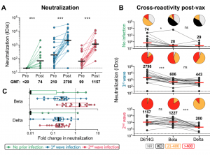 Neutralizing antibody responses to Ad26.COV2.S vaccination after prior infection. A. Neutralization of the SARS-CoV-2 D614G pseudovirus by plasma pre- and post-vaccination from participants with no prior infection (green, n=19) and those infected in the first (blue, n=20) and second waves (red, n=19). Neutralization is reflected as an ID50 titer. The threshold for positivity is indicated by a dotted line B. Cross-reactive neutralization post-vaccination against D614G, Beta and Delta variants. Pie charts show the proportion of vaccine non-responders (NR; grey), knock-out of neutralization of Beta or Delta (KO; black), titer of 20-400 (orange), or >400 (red). C. Fold change of post-vaccination D614G neutralization titers relative to Beta or Delta. The dotted line indicates a fold change of 1 (no change). The horizontal black and red bars indicate geometric mean titers, with values indicated on the graphs. Statistical analyses were performed using the Mann-Whitney test between groups, and the Wilcoxon test for paired analyses. * denotes p<0.05, *** p<0.001, ns, non significant. Experiments were performed in duplicate with the average value shown. (Source: Keeton et al., Pre-print)