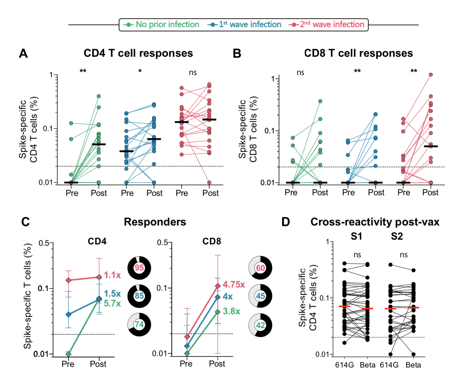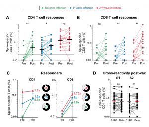 T cell responses to Ad26.COV2.S vaccination in the context of prior infection. A. Frequency of total cytokine-producing spike-specific CD4 T cells, and B. CD8 T cells, in those with no prior infection (green, n=19), infection in the first wave (blue, n=20), and infection in the second wave (red, n=19), in PBMC stimulated with a peptide pool based on Wuhan spike. C. Median fold-change of CD4 and CD8 T cell frequencies after vaccination in responders. Error bars indicate interquartile range. Pie charts indicate the proportion of responders (black) and non-responders (grey), indicated in the centre. D. Cross-reactivity of T cell responses post-vaccination. The frequency of cytokine-producing CD4 T cells post-vaccination in response to peptide stimulation with the S1 or S2 regions of spike from D614G or Beta is shown. Horizontal black or red bars indicate medians. The dotted line indicates the threshold for positivity and values are background-subtracted. Statistical analyses were performed using the Wilcoxon test. * denotes p<0.05, ** p<0.01, ns = non-significant. (Source: Keeton et al., Pre-print)
