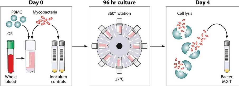 PBMCs were cultured together with BCG Pasteur for 96 hours in sealed rotating screw-cap tubes as well as static 48-well plates. At the end of the culture period, cells were lysed using different agents while other cells were not lysed at all. After centrifugation, the pellet was transferred to BACTEC MGIT tubes and the BACTEC system used to carry out mycobacterial quantification.