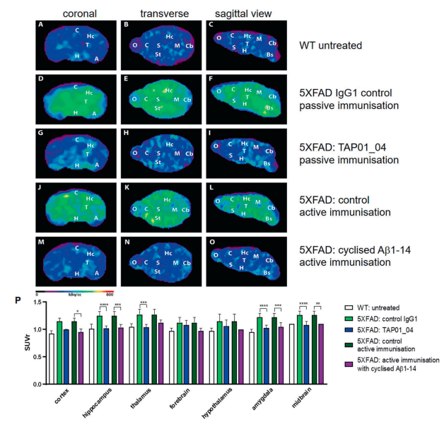 Figure 2: Active and passive immunisation reduced amyloid plaque load in 5XFAD mice. PET images with amyloid-plaque tracer florbetaben reveal a reduction in plaque load induced by either active immunisation with cyclised Aβ1-14 or treatment with the antibody TAP01_04 (passive immunisation). PET images (coronal, transverse and sagittal views) were obtained from untreated WT (n = 4) and active or passive immunised 5XFAD mice, with appropriate controls (n = 5 each group). A–C PET images of WT mice. D–F PET images of 5XFAD mice after passive immunisation with an isotype control antibody. G–I. PET images of 5XFAD mice after passive immunisation with TAP01_04. J–L PET images of 5XFAD mice following control active immunisation. M–O PET images of 5XFAD mice after active immunisation with the cyclized Aβ1-14 peptide. P Quantitative analysis showed lower signals in different brain areas. Abbreviations: WT wild-type, A amygdala, Bs brain stem, C cortex, Cb Ccrebellum, H hypothalamus, Hc hippocampus, M midbrain, O olfactory bulb, S septum/basal forebrain, St striatum, T thalamus. Statistical analysis of the PET retention signal intensities was carried out by one-way ANOVA with Bonferroni multiple comparisons (F = 14.28, p < 0.0001, R squared 0.7361). The quantitative data are presented as mean ± S.E.M; ****p < 0.0001; ***p < 0.001; **p < 0.01; *p < 0.05 (Bakrania, et al., 2021).