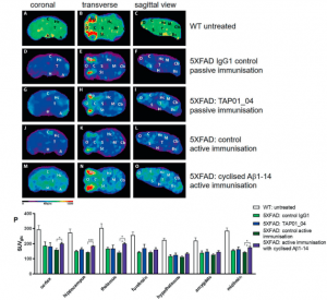 Testing this engineered protein in vivo, they found that mice receiving the engineered protein produced TAP01 type antibodies (Figure 2). Subsequently they tested both the TAP01_04 (Human) and the engineered ‘TAPAS’ vaccine, in two different murine models of AD. Using clinically relevant techniques, they found that both the antibody and the TAPAS vaccine helped to restore neuronal function through the reduction in Aβ-plaque formation (Figure 2), an increase glucose metabolism in the brain (Figure 3), memory rescue and inhibited neuron loss.