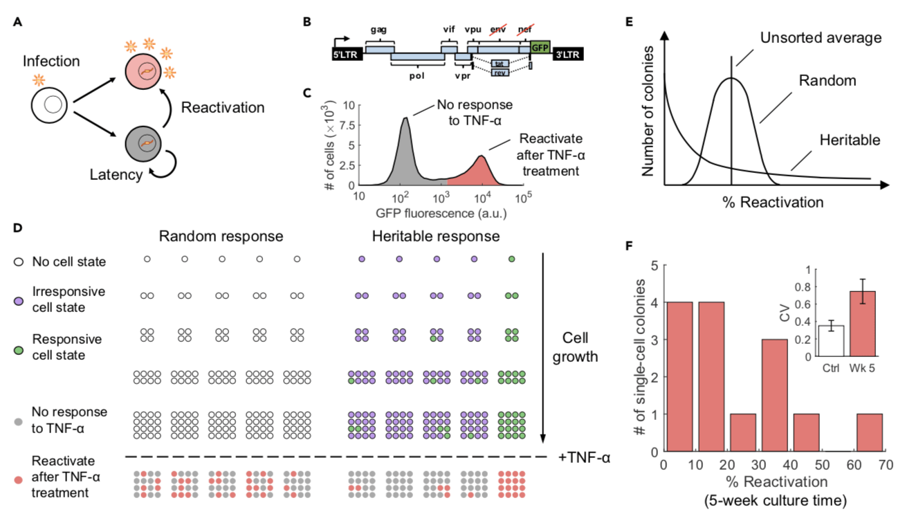 (F) Histogram of reactivation percentage of 14 different JLat 9.2 colonies after a 24-h TNF-a treatment. Colonies were cultured for 5 weeks after FACS and were grown from single cells sorted from a bulk JLat 9.2 clonal population. The resulting distribution coincides with the heritable response prediction and confirms that JLat cells possess heritable memory of responsiveness to TNF-a perturbation. Inset: The noise in percent reactivation (quantified using the coefficient of variation CV) is significantly higher than the control noise floor as measured by fluctuations in percent reactivation across unsorted JLat populations (p < 0.005). Error bars in the inset represent the standard error of CV. (Source: Lu et al. 2021)