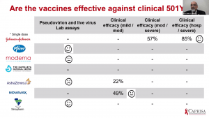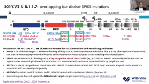 Prof. Shabir Madhi, one of the principal investigators involved in the ChAdOx1/nCoV-19 trial that took place in South Africa, presented data on 2000 participants enrolled in the trial. This vaccine was very immunogenic and induced antibodies in all vaccinated individuals. He demonstrated that before rapid transmission of the B.1.351 variant a single dose of ChAdOx1/nCoV-19 vaccine reduced the risk of acquiring mild/moderate COVID-19 by 75% 14 days post-vaccination. He then discussed factors that contribute to the selection of viruses with mutations (see image). Unfortunately, the ChAdOx1/nCoV-19 vaccine did not achieve the secondary endpoint of the trial: reduction of COVID-19 14 days after 2nd boost. Researchers observed similar proportions of COVID-19 cases in the placebo (n=23) and vaccine (n=19) of which 95% of cases were caused by the B.1.351 variant demonstrating an efficacy of 21.9% (-49.9- 59.8%). Using in vitro studies, they demonstrated that lower efficacy could be due to reduced Ab neutralisation against the B.1.351 variant. T cell profiling suggested that 76/87 known SARS-CoV-2 antigens recognised by T cells are unaffected by mutations in the B.1.351.  Prof Madhi then provided data on the Attack rate of seropositive individuals in the Novavax placebo groups that demonstrated that past infection does not protect against infection with the new variant. Thus, providing evidence as to why the 2nd wave in South Africa exceeded the 1st wave. He further showed that Novavax sub-unit vaccine provided some protection against the B.1.351 variant (efficacy of 49.4%)