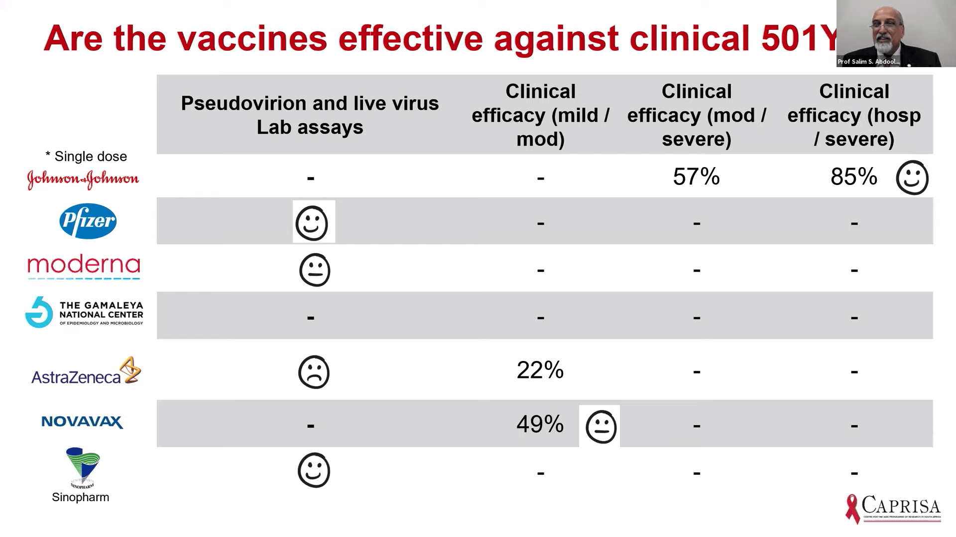 Prof. Glenda Gray then presented results of the Jannsen Ad26 COVID-19 vaccine trial (ENSEMBLE study). Unlike ChAdOx1/nCoV-19, Ad26 COVID-19 vaccine was administered as a single dose. The vaccine had a 66% efficacy (28 days post-vaccination) against developing moderate to severe COVID19 in all regions tested (the USA, Central & South America, South Africa. Unfortunately, the efficacy of this vaccine was 57% in South Africa, with nearly all (93%) cases due to the B.1.351 strain. Based on these results, the South African government is in talks with J & J to provide necessary data required to be approved by the SA medical regulatory body as well as acquire enough doses of the vaccine.