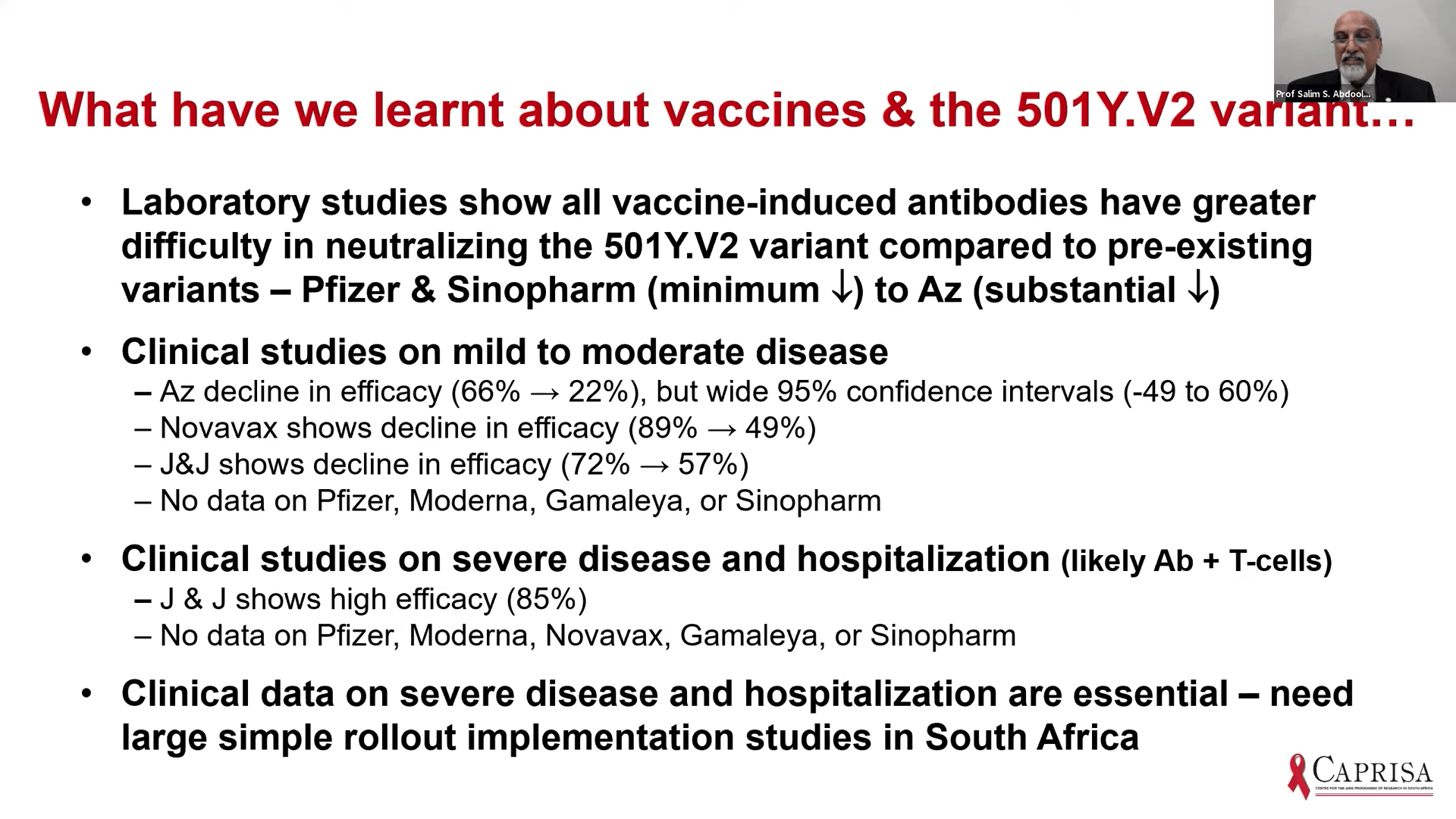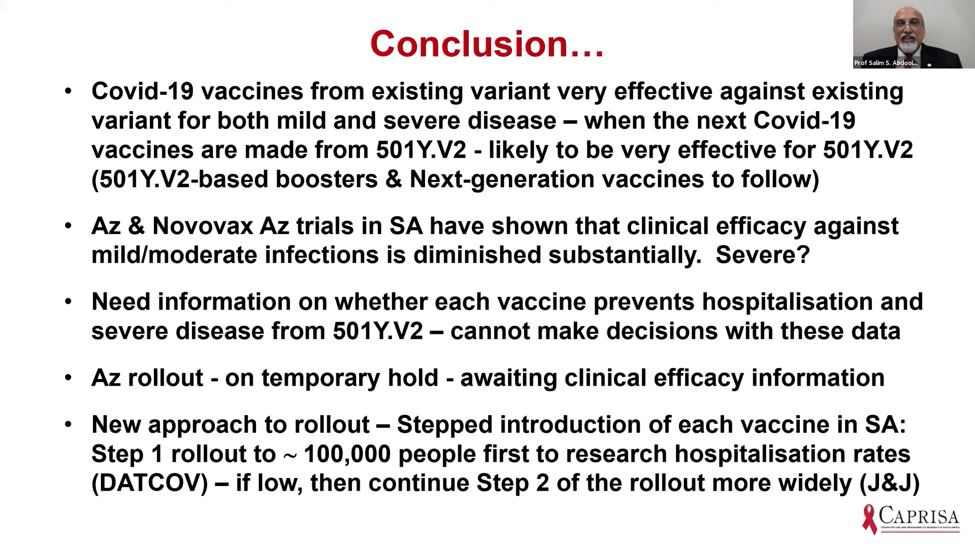 Prof Salim Abdool Karim gave the last presentation, which discussed the implication of vaccine trial results for vaccine roll out in SA. He demonstrated that vaccines with published data [Ad26 (J&J), BNT162b2 (Pfizer/BioNTech); mRNA-1273 (Moderna); ChAdOx1/nCoV-19 (Oxford/AstraZeneca] does show protection against mild to severe COVID-19 due to pre-existing variants they were designed. Based on lab-based assays, clinical efficacy against mild/moderate COVID-19 and severe COVID-19 hospitalisation, it suggests that the vaccine-induced antibodies may have a reduced effect against the new variants that contain N501Y mutations. Overall, all efficacy studies thus far demonstrate a decline in vaccine-induced effectiveness against mild/moderate COVID-19 due to B.1.351, however, Ad26 J& J was associated with an 85% efficacy against severe COVID-19. Based on this and evidence presented by Profs Madhi and Grey, the SA government has decided to temporarily hold roll-out of ChAdOx1/nCoV-19 vaccination till clinical efficacy information is available. The new approach would be a stepwise roll-out of vaccination to assess the hospitalisation rates before vaccination of the next group. This will ensure that vaccines that all rolled out for mass vaccination are effective against severe clinical COVID-19