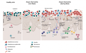 Atopic dermatitis or cutaneous eczema is a chronic, very complex disease which involves many factors such as genetic predisposition, environment factors, commorbidities, skin barrier dysregulation and pathological microorganisms colonization (READ MORE).