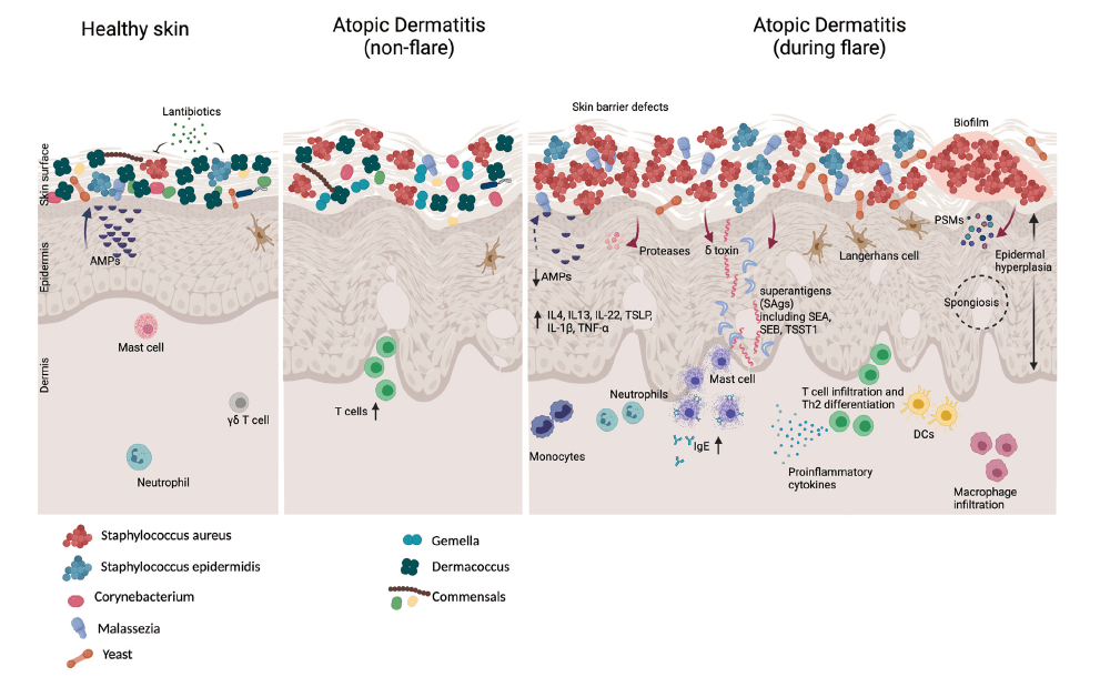 Koh, et al., suggested that microorganisms like Staphylococcus hominis , epidermidis and lugdunensis make biochemichal molecules that inhibit S.aureus proliferation on skin ; these molecules induced an immune regulation mechanism through the blockade of cytokines such as IL17, IL22 (Figure 1). Furthemore, other bacterial microorganisms like Cutibacterium acnes play a compounding role in atopic dermatitis pathophysiology ; this is seen through the inhibition of S.aureus and other pathological microorganisms development with bi-products formed from glycerol fermentation; In addition, supporting S.aureus proliferation as aggregation and biofilm formation facilitators.