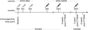 The authors show that these potentially protective IgG antibody responses against linear epitopes in the V2 and V3 HIV-1 Env regions are elicited in a high number of vaccinees by the initial DNA prime / MVA-CMDR boost HIVIS03 vaccination schedule and were readily boosted by a single dose of MVA-CMDR.