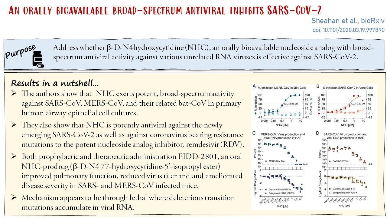 SARS-CoV-2 is a zoonotic virus which causes the disease COVID-19 and there are currently no approved therapies. Sheahan et al recently pre-published a paper that states that ribonucleoside analog β-D-N4-hydroxycytidine (NHC, EIDD-1931) has broad spectrum antiviral activity against SARS-CoV 2, MERS-CoV, SARS-CoV, and related zoonotic group 2b or 2c Bat-CoV. The researchers also stated that there is an increased potency against a coronavirus bearing resistance mutations to another nucleoside analog inhibitor.