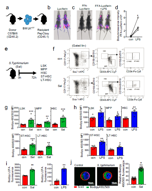 Figure 1: Infection with S. typhimurium drives long-chain fatty-acid uptake in HSC. a) Schematic diagram of experimental design. WT CD45.2 lineage negative, CD117-positive (LK) cells were isolated and transduced with firefly luciferase (LK+FF) and transplanted into WT CD45.1 animals. b) Mice were imaged using bioluminescence imaging to confirm engraftment. c) Mice were injected with control PBS for 16 hours then treated with FFA-SS-luc and imaged using bioluminescence (FFA-luciferin). One-week later mice were injected LPS for 16 hours then treated with FFA-SS-luc and imaged using bioluminescence Representative images of control and LPS-treated mice. d) Densitometry of the bioluminescent images in (c) to determine fluorescence intensity in the vehicle and LPS-treated animals. n = 4. e) Schematic diagram of experiment in which C57BL/6 J mice were infected with S. typhimurium (Sal) for 72 hours and analyzed for LSK, MPP, HSC, ST-HSC, and LT-HSC populations by flow cytometry. f) The gating strategy used to identify the LSK, MPP, HSC ST-HSC, LT-HSC populations are shown. g) Lipid content (Bodipy 493/503 mean fluorescence intensity (MFI)) was assessed by flow cytometry from control and S. typhimurium (Sal) (72 hours) treated mice. n = 7 in each group. h C57BL/6 J mice were treated with 1mg/kg LPS for 16 hours, the bone marrow was extracted, and the cells were analyzed by flow cytometry for lipid content (Bodipy 493/503 MFI) n = 6 in each group. i C57BL/6 J mice were infected with S. typhimurium (Sal) for 72 hours or LPS for 16 hours. Long-chain fatty-acid (LCFA) uptake was measured using the QBT assay. n = 5 in each group (j) C57BL/6 J mice were infected with S. typhimurium (Sal) for 72 hours. Representative live-cell fluorescent microscopy images of LSK cells isolated from the mice, Sca1 membrane stain (red), Bodipy 493/503 (green), and Hoechst 33342 (blue). Quantification of Bodipy 493/503 fluorescence in LSK cells from images shown, 20 LSK cells from five mice in each condition. Data shown are means ± SD. The Mann–Whitney U test (two-tailed) was used to compare between treatment groups *p < 0.05 **p < 0.01 ***p < 0.001. Source data are provided as a Source Data file (Mistry, et al., 2021).