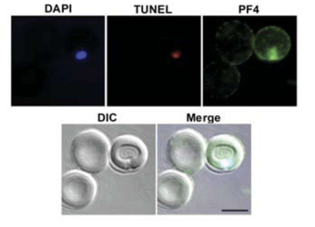 Koh et al., 2018 Fig 3I: Micrographs showing a PF4+TUNEL+ P. knowlesi infected cell after platelet treatment. Scale bars = 5 μm. Images were taken at 630x magnification on an Axio Observer inverted fluorescence microscope coupled to an Axiocam 503 monochrome camera with ZEN 2 software (Carl Zeiss, Germany). Bars indicate means of replicate data points. Abbreviation: DIC, differential interference contrast.