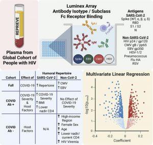 The total study showed that higher CMV and EBV antibody responses were linked to COVID-19 infection. Higher BMI was linked to an amplified SARS-CoV-2 response in COVID-positive individuals, while lower nadir CD4+ T-cell count (a person’s lowest CD4+ T-cell count) was linked to an ineffective or weakly functional antibody response to SARS-CoV-2.