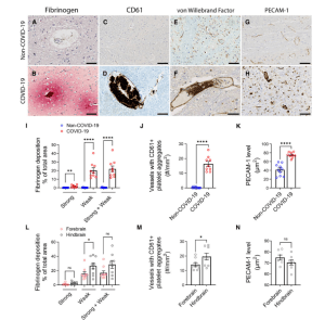 Figure 1: Microvascular injury and thrombus formation. Immunostaining for (A and B) fibrinogen, (C and D) CD61 for activated platelets, (E and F) vWF and (G and H) PECAM-1 shows absence or minimal staining in the non-COVID-19 brain but in the COVID-19 patients, there was (B) perivascular leakage of fibrinogen, (D) platelet aggregates, (F) thrombi and (H) increased PECAM-1 on endothelial cells. Significantly greater (I) leakage of fibrinogen (**P = 0.0011, ****P < 0.0001) and (J) blood vessels with platelet aggregates were present in the COVID-19 brains (****P < 0.0001). (K) PECAM-1 was significantly increased in the brains of COVID-19 patients compared to non-COVID-19 controls (****P < 0.0001). (L–N) Dots represent the average of individual values in the brain regions that make up the forebrain or hindbrain of a patient. The forebrain includes the cerebrum, basal ganglia and thalamus. The hindbrain contains the pons, medulla and cerebellum. (L) Strong fibrinogen deposition was equally distributed in different regions of the brain, while weak deposition was more prevalent in the hindbrain compared to the forebrain (*P = 0.04). (M) There were more thrombi in the hindbrain compared to the forebrain of the COVID-19 patients (*P = 0.04). (N) PECAM-1 immunostaining was equally distributed in different brain regions of the COVID-19 patients. Data represents mean ± SEM. Scale bars = 100 µm (Lee, et al., 2022).