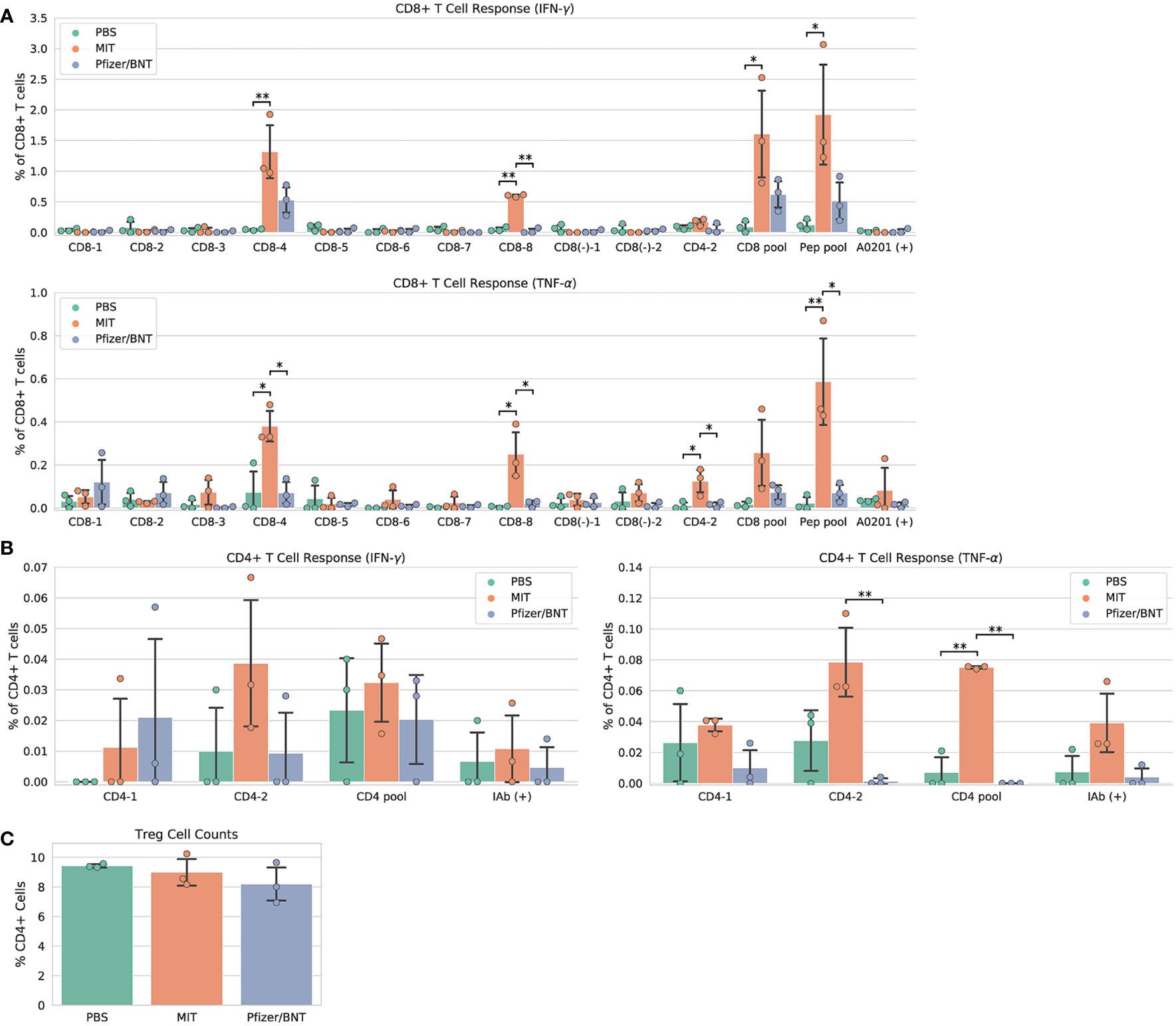 Figure 1: Vaccine immunogenicity. (A) CD8+ T cell responses, (B) CD4+ T cell responses, (C) Foxp3+ regulatory T cells (Tregs) as a percentage of all CD4+ cells. The CD8 pool includes MHC class I peptides CD8-1—CD8-8 (Supplementary Table 1). The CD4 pool includes MHC class II peptides CD4-1 and CD4-2. The Pep pool includes all query peptides in Supplementary Table 1 except CD4-3. Error bars indicate the standard deviation around each mean. P values were computed by one-way ANOVA with Tukey’s test. *P < 0.05, **P < 0.01.