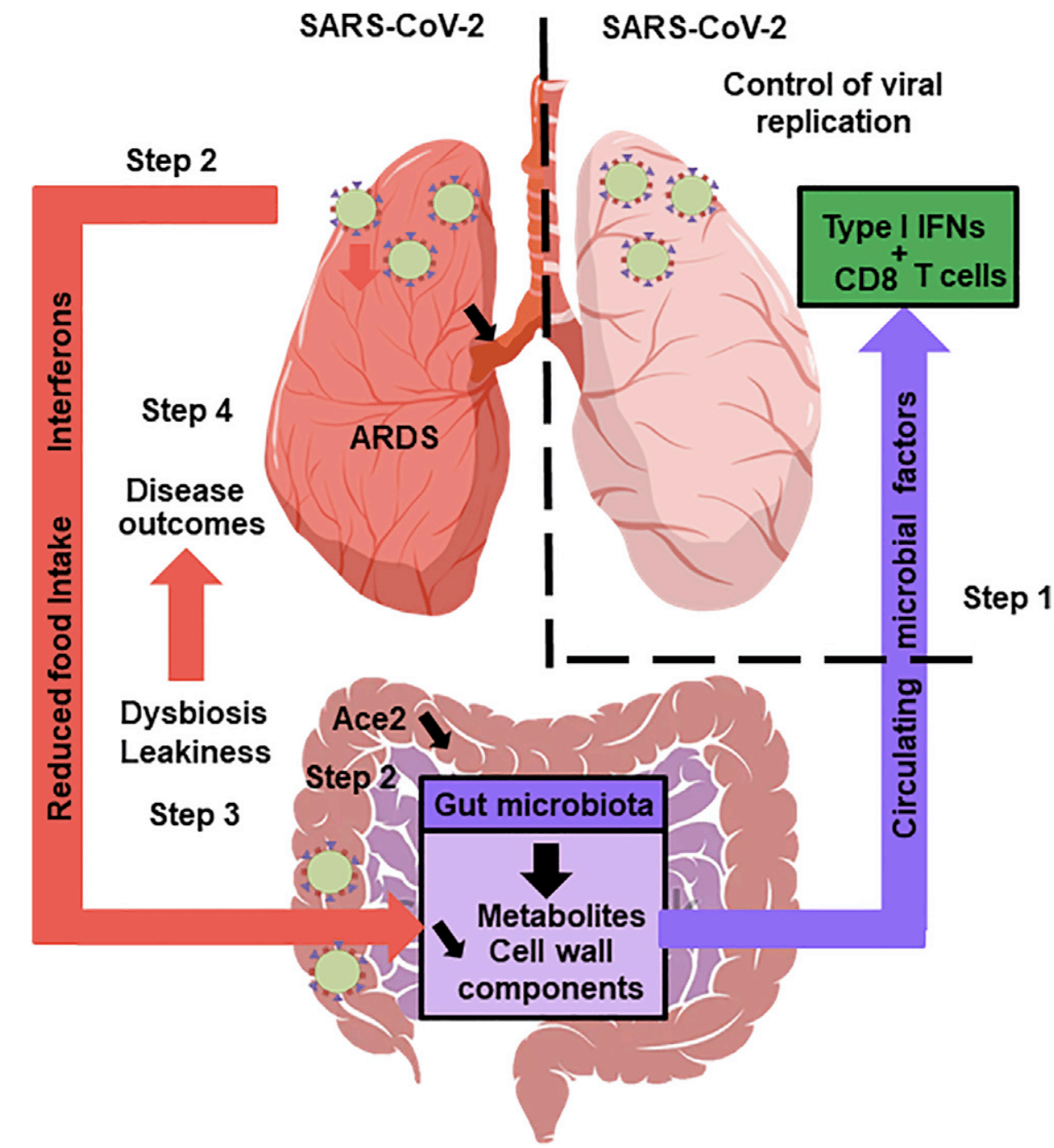 The Gut Microbiota’s Hypothetical Role in SARS-CoV-2 Infection: A healthy gut microbiota boosts the lungs’ antiviral response, including inter- feron production and the effector function of CD8+ T cells (step 1). Soon after infection, SARS-CoV-2 replicates in the intestinal compartment and decreases the expression and activity of ACE2 (step 2). This leads to gut dysbiosis and gastrointestinal symptoms (step 3). Meanwhile, viral infection of the lungs triggers the systemic production of interferons and elicits weight loss, both of which trigger gut dysbiosis (step 3). Changes in the composition and functional activity of the gut microbiota and impairment of the gut’s barrier function contribute to disease outcomes, including ARDS, a systemic cytokine storm, and multiorgan dysfunction (step 4). (Source: Trottein & Sokol, Cell Reports 2020)