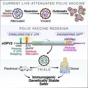 In response to this global challenge, researchers  (Yeh et al., 2020) have modified the Sabin vaccine strain (nOPV2) making it less likely to regain virulence as the original Sabin strain. Specifically, they introduced “modifications in the 5’-UTR that prevent the reversion of a major ‘‘gatekeeper’’ attenuation determinant within domV.” Using cell cultures and animal models they showed that genetic modification of nOPV2 did not affect the thermal stability, replication competency nor the immunogenicity profile the vaccine as compared to the origin Sabin vaccine strain. This vaccine was also tested in a phase 1 trial and demonstrated safety and immunogenicity in IPV-immunised healthy adults (n=15; Van Damme et al, 2019)
