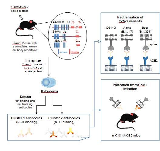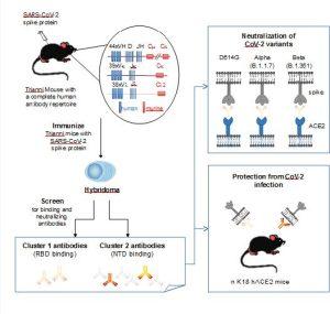 Hans-Martin et al reported the isolation of monoclonal antibodies from TRIANNI mice, mice carrying an entire set of human immunoglobulin V region gene segments (Figure 1). These monoclonal antibodies can be used to target the RBD or the NTD of the spike protein of SARS-CoV-2, providing a pair of non-competing human monoclonal antibodies for clinical development.