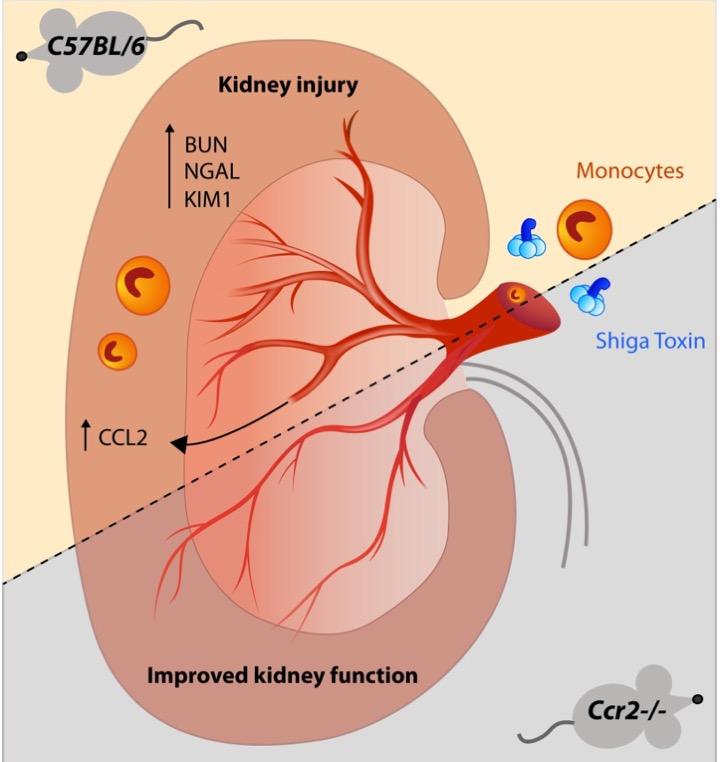 HUS has also been associated with increased levels of chemokines CCL2, CCL3 and CCL5, that that recruit monocytes via the chemokine receptor CCR2. High expression of CCR2 on Gr1high monocytes suggested that CCR2 is required for Gr1high monocytes to contribute to immunopathology. Indeed Pohl et al., demonstrated that in absence of CCR2 there was a reduction on recruitment of Gr1high monocytes, this was associated with reduced kidney damage and increased survival.