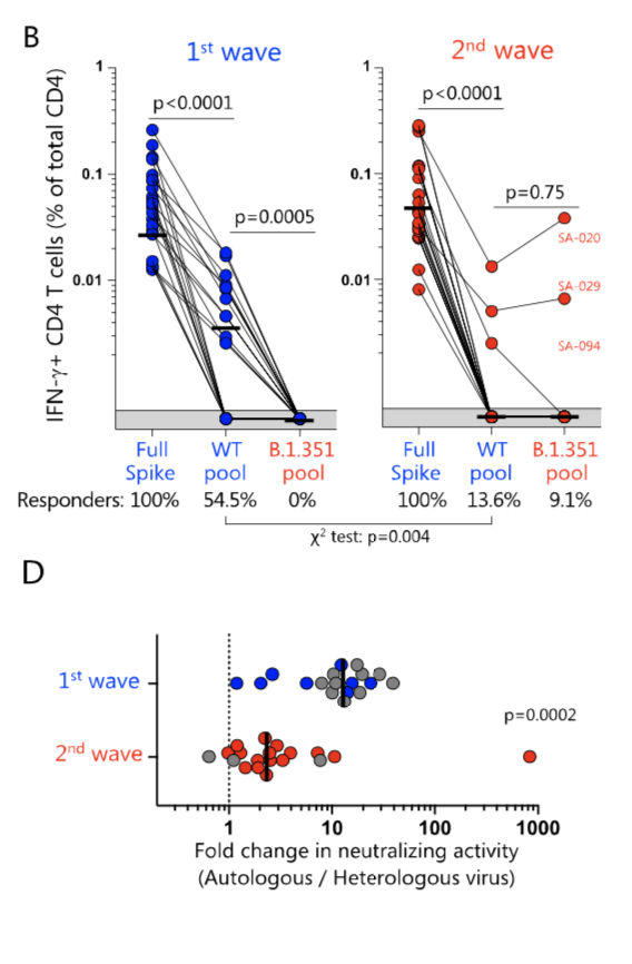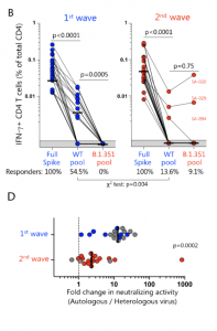 Loss of recognition of SARS-CoV-2 B.1.351 variant epitopes and neutralizing antibody responses. (B) Summary graphs of the frequency of IFN- -producing SARS-CoV-2-specific CD4 T cells in first wave (n = 22, left) and second wave (n = 22, right) COVID-19 patients. The proportion of patients exhibiting a detectable response to the different peptide pools (i.e., responders) is indicated at the bottom of each graph. (D) Fold-change in neutralization titers of plasma samples from COVID-19 patients recruited during the first wave (n = 18) or the second wave (n = 19) were tested for their neutralization cross-reactivity against the ancestral or B1.351 pseudoviruses. Bars represent medians. Statistical analyses were performed using the Wilcoxon test and the chi-squared test.