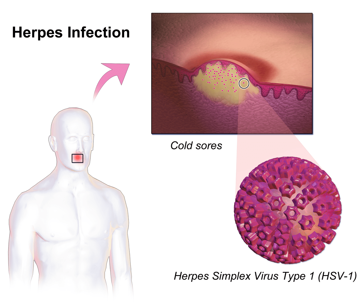 Herpes is a life long infection caused by either herpes simplex virus type 1 (HSV-1) or type 2 (HSV-2), with an estimated worldwide prevalence of 67% and 11%, respectively. HSV-1 predominantly causes oral herpes (cold sores) but can also cause genital herpes, a sexually transmitted infection, whereas HSV-2 primarily causes genital herpes. There is currently no cure for Herpes, however therapeutics that alleviate symptoms are available.