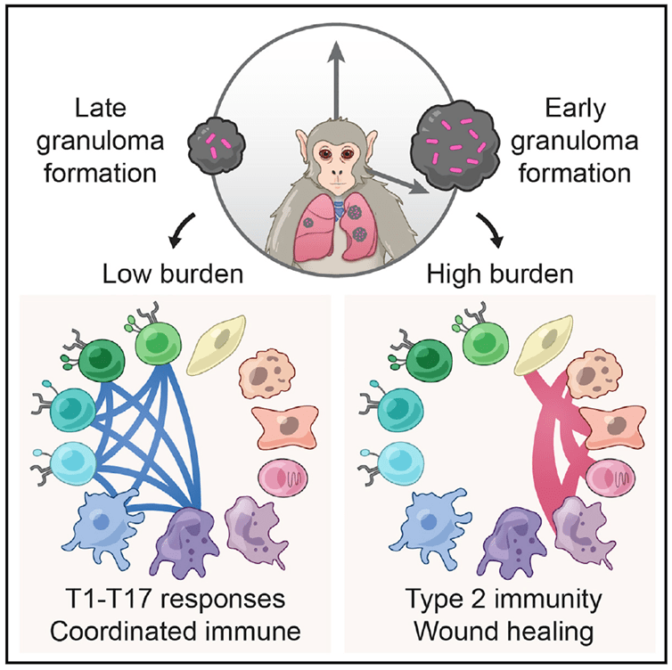 From data that was generated using a combination of longitudinal PET-CT, bacterial burden assays, and scRNA-seq techniques, Gideon et al established that type 2 immunity and responses responsible for wound healing determined how high TB bacterial burden was within the granulomas. These two immune responses, in a bid to preserve tissue in the lungs, end up creating an environment that favors the persistence of Mtb.