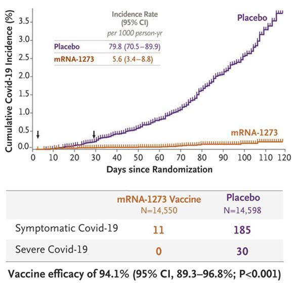 The two doses of mRNA-1273 vaccine showed 94.1% efficacy at preventing COVID-19 illness including severe disease in persons 18 or older. Aside from transient local and systemic reactions, no safety concerns were identified.
