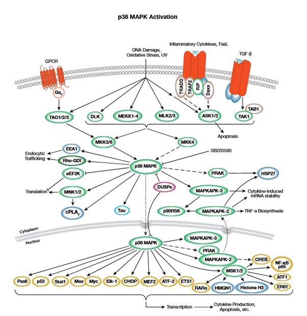 Figure 1: p38 MAPKs (α, β, γ, and δ) are members of the MAPK family that are activated by a variety of environmental stresses and inflammatory cytokines. As with other MAPK cascades, the membrane-proximal component is a MAPKKK, typically a MEKK or a mixed lineage kinase (MLK). The MAPKKK phosphorylates and activates MKK3/6, the p38 MAPK kinases. MKK3/6 can also be activated directly by ASK1, which is stimulated by apoptotic stimuli. p38 MAPK is involved in regulation of HSP27, MAPKAPK-2 (MK2), MAPKAPK-3 (MK3), and several transcription factors including ATF-2, Stat1, the Max/Myc complex, MEF-2, Elk-1, and indirectly CREB via activation of MSK1 (https://www.cellsignal.com/pathways/p38-mapk-signaling).