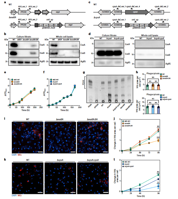 Figure 1: Characterization of Mtb ΔesxBA and Mtb ΔcpsA. a,c, Mtb esxBA- rv3874-75 locus (a) and cpsA-rv3484 locus (c) in Mtb WT and the respective deletion strains. Black half-arrows depict the primer positions (CmR, chloramphenicol resistance; ZeoR, zeocin resistance; Prom., groEL promoter). b,d, Western blot of EsxA and EsxB from total cell lysates and culture filtrates from Mtb WT, ΔRD1, ΔesxBA, ΔesxBA:BA (n = 3) (b) or Mtb WT, ΔcpsA and ΔcpsA:cpsA strains (n = 1) (d). Ag85 was used as a loading control. e, Growth curves of Mtb WT, ΔesxBA and ΔesxBA:BA. f, Growth curves of Mtb WT, ΔcpsA and ΔcpsA:cpsA strains. g, Thin-layer chromatography analysis of PDIM from Mtb WT, ΔcpsA, ΔcpsA:cpsA, ΔesxBA and ΔesxBA:BA cultures (n = 1). Purified PDIM and extracts from Mtb ΔPDIM were used as controls. h, Quantitative analysis of Mtb WT, ΔesxBA, ΔesxBA:BA (top) and Mtb WT, ΔcpsA, ΔcpsA:cpsA (bottom) area per single cell, 2 h post infection.Representative data of three independent experiments (n = 3 independent wells). Results are shown as mean ± standard error of the mean (s.e.m.). One-way ANOVA followed with Šídák’s multiple comparison test. NS, non-significant. i, Snapshot of live iPSDM infected with Mtb WT, ΔesxBA and ΔesxBA:BA 96 h post infection. Nuclear staining (blue) and Mtb-E2-Crimson (red). Scale bars, 50 μm. j, Quantitative analysis of Mtb replication after infection with Mtb WT, ΔesxBA and ΔesxBA:BA. Mtb area per cell was calculated as fold change, relative to 2 h post infection. Representative data of three independent experiments (n = 3 independent wells). Results are shown as mean ± s.e.m. One-way ANOVA followed with Šídák’s multiple comparison test. ***P < 0.001; NS, non-significant. k, Representative images of fixed iPSDM infected with Mtb WT, ΔcpsA and ΔcpsA:cpsA 96 h post infection. Nuclear staining (blue) and Mtb-E2-Crimson (red). Scale bars, 50 μm. l, Quantitative analysis of Mtb replication after infection with Mtb WT, ΔcpsA and ΔcpsA:cpsA. Mtb area per cell was calculated as fold change, relative to 2 h post infection. Representative data of three independent experiments (n = 3 independent wells). Results are shown as mean ± s.e.m. One-way ANOVA followed with Šídák’s multiple comparisons test **P < 0.002; NS, non-significant