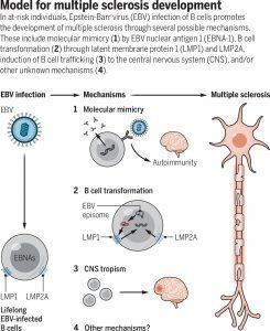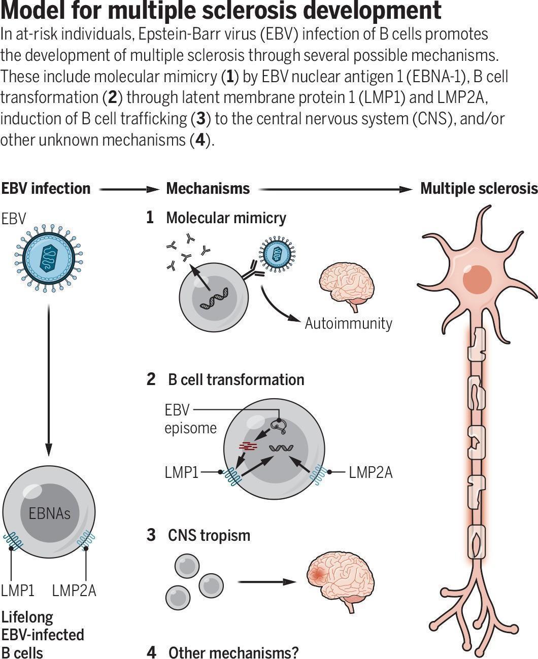 Although these findings provide compelling data that implicate Epstein-Barr virus as the trigger for the development of multiple sclerosis, the mechanism (or mechanisms) of EBV-mediated MS development remains elusive. Possibilities include molecular mimicry, through which EBV viral protein sequences mimic human myelin proteins and other CNS proteins and thereby induce autoimmunity against myelin and CNS antigens.