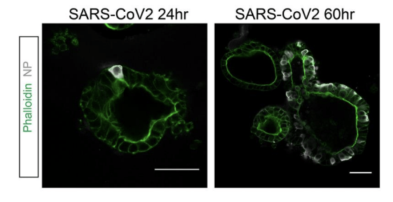 Immunofluorescent staining of SARS-CoV-2-infected intestinal organoids. Nucleoprotein (NP) stains viral capsid. After 24 hours, single virus-infected cells are generally observed in organoids. These small infection clusters spread through the whole organoid after 60 hours. (Source: Lamers et al., 2020)