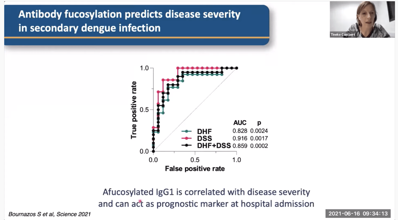 • Severe disease is associated with an increase in IgG binding to DENV infected cells and ADE, as well as increased IgG1 afucoscylation