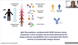 Dengue virus (DENV), transmitted by Aedes aegypti/Albopictus mosquito, is the most widespread of Arboviruses infection with no treatment and only one licenced partially effective vaccine (Dengvaxia ®). There is a wide spectrum of diseases ranging from asymptomatic dengue infection to dengue shock syndrome. She also gave an overview of immune responses associated with DENV disease, highlighting that Dengue is characterised as an immunopathology because severe symptoms (e.g. risk of shock and haemorrhage) occur when viral load is low/undetected.