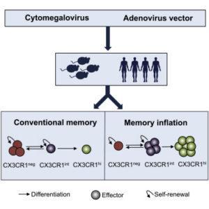 Gordon et al., aimed to determine the role of CX3CR1int TPMs in the induction and maintenance of conventional and inflating (see definition below) memory T cell population during persistent viral infection and non-replicative viral vector vaccination. Researchers utilised an in vitro mouse model of mouse cytomegalovirus (MCMV) to illustrate that high and low doses MCMV infections drive induction of conventional and inflating memory cells that are predominantly CX3CR1hi and CX3CR1int, respectively. However, differences between conventional and inflating memory T cells were observed in response to adenovirus vaccination. Where adenovirus vaccination induced conventional memory T cells that were predominantly CX3CR1neg and resembled TCM (CD62L-, CD27-, CD127-), while inflating memory T cells were both CX3CR1int and CX3CR1hi with a TEM (CD62L-, CD27-, CD127-) phenotype. This suggested a relationship between high antigen load and differentiation/accumulation of CX3CR1int/hi. Researchers were able to confirm this by illustrating that memory T cells observed in spleen, liver and lung (main sites of CMV replication) had predominantly CX3CR1int/hi inflating memory T cells. Gordon et al, also showed that though CX3CR1 was not required for induction of vaccine responses. However, absence of CX3CR1 resulted in suboptimal levels of inflating memory T cells. Similar results were observed in cohort analysis of humans infected with CMV and vaccinated with adenovirus.