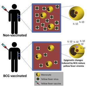 One of the aims of a study led by Mihai Netea was to examine the effects of BCG-induced trained immunity on viral infection. Using yellow fever vaccination as a model of viral human infections,  researchers observed reduced viremia in individuals that received BCG vaccination prior to the yellow fever vaccine compared to cotnrols. Reduced viremia was not associated with reduced levels of yellow fever neutralising antibodies nor yellow fever-specific T cells responses. Illustrating that BCG vaccination did not impair yellow fever induced vaccine responses. Reduced viremia in BCG vaccinated individuals was associated with epigenetic reprogramming of monocytes resulting in increased levels of IL-1β. This study demonstrated a role of IL-1β mediated responses in trained immunity, highlighting the crucial role the IL-1 pathway plays in induction of trained immunity in humans.