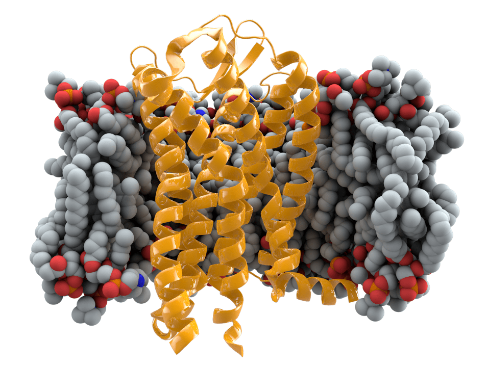CCR5 receptor (yellow, based on PDB 4MBS) in cell membrane (grey, modeled)(Source: Wikimedia, Author: Thomas Splettstoesser)
