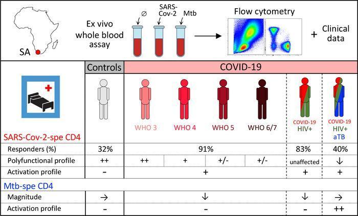 HIV-1 and TB co-infection skews the SARS-CoV-2 T cell response. “HIV-1 mediated CD4+ T cell depletion associated with suboptimal T cell and antibody responses to SARS-CoV-2 and a decrease in the polyfunctional capacity of SARS-CoV-2-specific CD4 T cells was observed in COVID-19 patients with active TB”. These results reinforce the crucial role of SARS-CoV-2-specific T cells in COVID-19 disease development and support the concept of altered T cell functions in patients with severe disease.