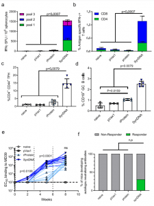 Figure 2: DNA immunization of BG505.MD39 induced stronger T-cell responses and NAb responses than protein immunization in BALB/c mice. All mice in this panel were immunized at Wks 0, 3, 6 with 25 ug DNA or 25 ug RIBI-co-formulated protein and euthanized 2 weeks post the final vaccination for cellular analyses. a, b Comparison of BG505 Env-specific cellular responses in naïve mice, or mice immunized with pVAX plasmid backbone, RIBI-coformulated protein BG505.MD39, or DNA-encoded BG505.MD39 by IFNγ ELIspot assay (a) or intracellular cytokine staining (b). c Frequencies of CXCR5 + PD1 + Tfh cells amongst CD4 + CD44 + cells in the draining lymph nodes in naïve mice or 10 days post pVAX1, protein MD39 or DNA BG505.MD39 immunization. d Frequencies of GL7 + GC B cells amongst CD19 + B cells in the draining lymph nodes in naïve mice or 10 days post pVAX1, protein BG505.MD39 or DNA BG505.MD39 immunization. e Trimer-specific binding antibody responses induced in mice vaccinated with protein or DNAencoded BG505.MD39 post the first, second and third immunization as determined by ELISA. f Frequencies of mice that developed autologous BG505.T332N neutralizing antibodies (ID50 titers greater than 1:45) in naïve mice or mice immunized with pVAX1, protein BG505.MD39 or DNA-encoded BG505.MD39 two weeks post the final vaccination. The dashed vertical line in e refers to the immunization timepoints. Two independent experiments were performed for each panel in the figure. N = 10 mice/group for protein or DNA-encoded BG505.MD39, N = 5 mice/group for naïve mice or pVAX1 treated mice (a, b, e, f); N = 5 mice/group (c, d); each dot or line represents an animal. Error bar represents standard deviation. Center of the error bar represents the mean. Two-tailed Mann–Whitney Rank test used to compare groups; p-values were adjusted for multiple comparison for panels (a–d). Twotailed Mann–Whitney Rank tests were used to compute the p-values comparing EC50 titers between protein and DNA groups for each specific timepoint in e. Two-sided Fisher Exact Tests were used to compare proportion of responders between SynDNA group and naïve/ pVAX1/ protein groups in f. ns not significant. Source data are provided as a Source Data file (Ziyang, et al., 2022).
