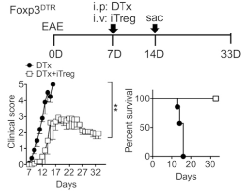 Experimental design of EAE induction and Treg adoptive transfer. Groups (n = 5∼ 8) of Foxp3DTR mice were induced for EAE as described in Materials and Methods. At disease onset (7 d postinduction), mice were treated with 1 mg of DTx alone (filled circle). Some mice received 5 3 106 Foxp3+ iTregs together with DTx (open square). The mice were daily monitored and scored for clinical diseases and survival. (Source Kim et al., Fig 1.A)