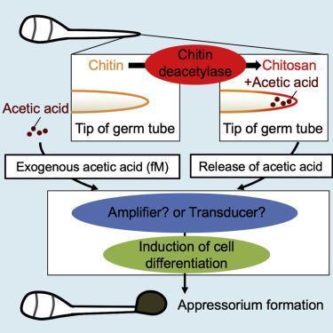 Figure: During infection in rice blast fungus, chitin from its cell wall breaks down into chitosan and acetic acid. This process stimulates cell differentiation in the host plant, leading to appressorium formation, which then facilitates the infection process.