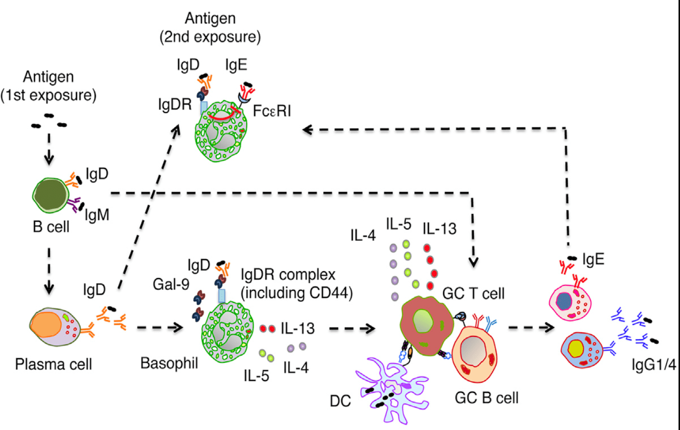 In summary Shan et al., illustrated one of the functional roles of IgD where, secreted IgD binds to basophils via the CD44 interaction protein galectin-9. Binding then induces expression of IL-4, Il-5 and IL-13 by basophil-bound IgD, creating an immune microenvironment favouring Th2 cell type activity. Finally, IgD also dampens IgE mediated immunity, could be used to attenuate IgE dependent allergic reactions to food allergins.