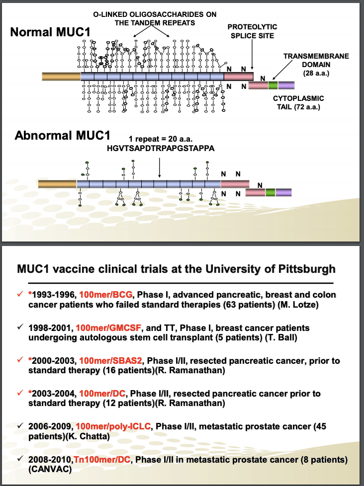 She then presented summary data on the MUC1 protein-based vaccines that have been tested in clinical trials and demonstrated modest immunogenicity (20% of vaccinees) and success rates (approximately 20% of vaccinees had a prolonged time to recurrence).