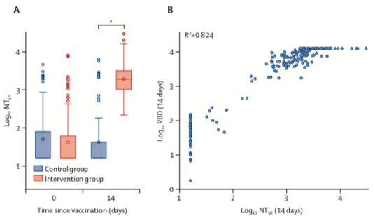 (A) Neutralising antibodies measured in both intervention and control groups on days 0 and 14. (B) Correlation between NT50 and RBD (anti-spike protein) antibody titres. NT50=titres that achieved 50% neutralisation. RBD=receptor-binding domain. *p<0·0001. (Borobia et al. 2021)