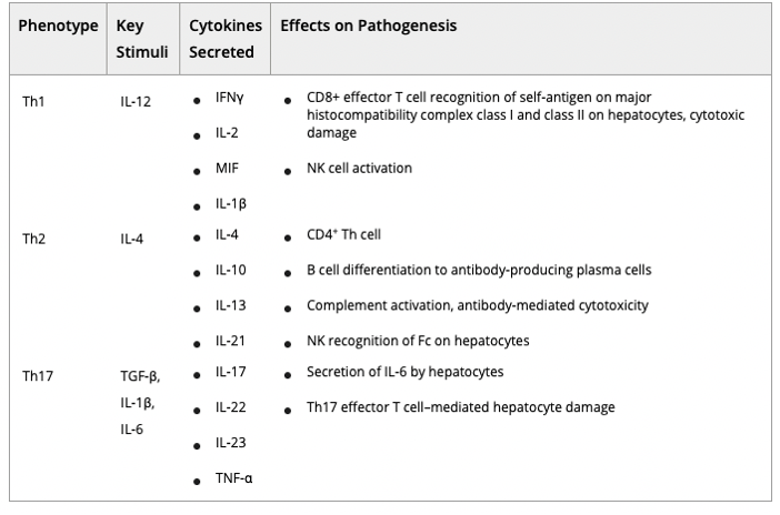 Cytokines produced locally such as IL-12 help naive T cell differentiate to a Th1, characterized by secretion of IFN-γ, IL‐2 with development of activated macrophages and effector CD8+ T cells. This will cause direct cytotoxic damage to antigen‐expressing hepatocytes. IL‐4 promotes Th2 phenotype, characterized by IL‐10, IL‐4, and IL‐13 secretion, which promotes B cell differentiation to antibody‐producing plasma cells and complement activation. Transforming growth factor β (TGF‐β) and IL‐6 result in the promotion of a Th17, principal cause of liver damage and inflammation. A dynamic balance between proinflammatory Th17 and immunosuppressive Tregs can critically determine the immunopathology of AIH. (Table 1 )
