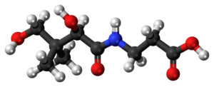 Ball-and-stick model of the pantothenic acid molecule, the most common form of Vitamin B5. Key: Carbon-black, Hydrogen-white, Oxygen-red and Nitrogen-blue. Jynto, Wikimedia commons.