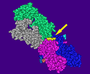 Complex of the human alpha/beta T cell receptor (green & grey) HA1.7, influenza hemagglutinin peptide (yellow), and major histocompatibility complex class II molecule, HLA-DR4 (blue & magenta). Created from MMDB entry 18804 using visualization package Cn3D4.1. Wikimedia Commons