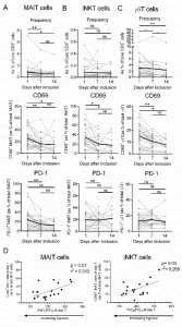 Researchers observed that innate T cells from COVID-19 patients were highly pro-inflammatory characterised by high expression of IL-17 but not IFN-g, compared to healthy controls. Interestingly, MAIT cells and iNKT cells from COVID-19 patients expressed high levels of both CD69 and PD-1, markers associated with activation and exhaustion, respectively. Based on this, and other evidence described in the Pre-print author concluded that sever COVID-19 is associated with “an altered innate T cell biology that may account for the dysregulated immune response observed in COVID-19-related acute respiratory distress syndrome.”