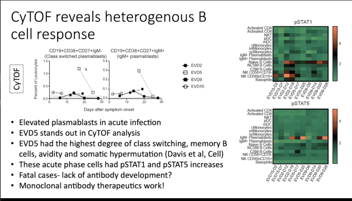 McElroy presented data that demonstrated that severe disease and high viral load is associated with T cell activation, B cell expansion and monocyte redistribution as well as alterations in dendritic cells. These findings provide clues as to why EVD is so severe. Specific differences observed during EVD pathology compared to controls were: