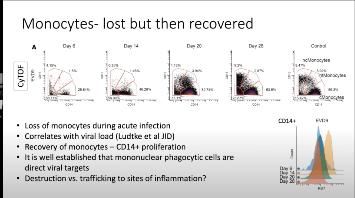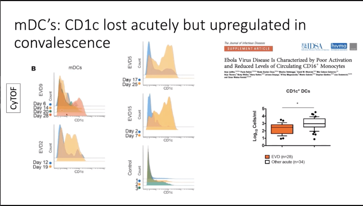 - Significant reduction of all monocyte populations (i.e. Classical, non-classical and intermediate monocytes) and myeloid-derived DCs (mDCs). These cell populations are quickly replenished (by day 28 post-symptom onset) upon recovery of EVD.