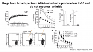 Murine models of arthritis have demonstrated that pathology is associated with a reduction of commensal bacteria and short-chain fatty acids such as butyrate compared to naïve mice, a similar finding also observed in humans. Using a murine model, Claudia Mauri demonstrated that suppression of arthritis pathology by butyrate supplementation is B-reg dependent and requires induction of B-regs via aryl-hydrocarbon receptor (AhR). She also showed that butyrate-supplementation prevents plasmablast and germinal centre differentiation. Is this process direct or indirect? Microbial analysis butyrate supplemented mice demonstrated an increase in bacteria that metabolise tryptophan, an amino acid involved in and leads to the production of serotonin, indole and kynurenine, and also activate AhR. Analysis of metabolic products in mice supplemented with butyrate demonstrated a significant increase in serotonin-derived metabolite 5-Hydroxyindole-3-acetic acid (5-HIAA). Further, she showed data that 5-HIAA activates B-regs via activation of AhR and suppressed arthritis pathology.